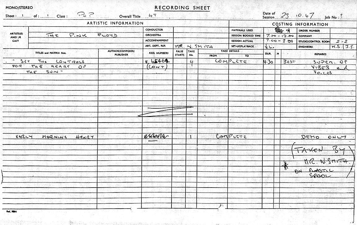 В тот день Флойды работали с Норманом "Hurricane" Смитом и сделали с утра четыре дубля новой композиции "Set the Controls for the Heart of the Sun", а затем в один тэйк записали песню Билли Батлера "Early Morning Henry". Как следует из примечания в том же листе учета студийного времени, записанная вещь ушла из студии вместе с Норманом Смитом, чтобы исчезнуть на долгие 53 года...