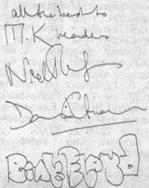 Удалось с трудом протиснуться к «великолепной тройке». Намин представил членам «Пинк Флойд» журналистов «МК». Англичане с интересом рассмотрели последний выпуск «ЗД» и согласились ответить на пару вопросов. Из ответов стало ясно, что они всегда мечтали участвовать в чем-нибудь космическом (судя по их музыке, это действительно так), поэтому с огромным восторгом приняли предложение присутствовать при запуске космического корабля с советско-французским экипажем на борту. После чашки чая в «Хард Рок Кафе» делегация прошествовала в одну из репетиционных комнат, где занималась группа «Николай Коперник». Юрий Орлов и его команда спели в честь именитых гостей «Капитанов космических рек». Некоторое время Гилмор неподвижно смотрел в одну точку. Затем его лицо оживилось и он стал покачивать в такт головой. После прослушивания довольно продолжительной композиции (которая, кстати, свидетельствует, что музыка «НК» становится живее и веселее) Гилмор сказал, что все это весьма экзотично и любопытно.