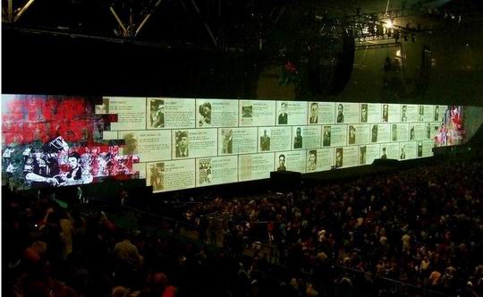 Перерыв опять застигает врасплох. Стена освещена и представляет собой десятки имен и лиц тех самых жертв войны. Одни постепенно сменяют других. Разные эпохи. Разные страны, возрасты; пол, национальности не имеют значения. Здесь вся карта мира. Чьи-то дети, братья, отцы. Звучит красивая музыка с объемным женским вокалом и этномотивами на восточный лад. Грустная, но доза чувства выверена идеально навевает размышления, не уводя от момента.