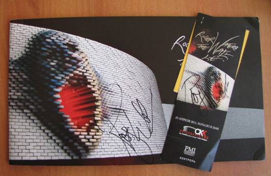 По окончании шоу я сразу пошел искать охранника Тимура, но его нигде не было видно. Девушка-контролер сказала, чтобы я подождал, он, мол, сейчас подойдет. Минуты через три Тимур появился и отдал мне билет. Несмотря на то, что он был сложен (я отдавал не сложенный), я был очень рад возвращению реликвии законному владельцу. Потом подобрал несколько бумажек, падавших с потолка во время “Outside the Wall” и пошел к выходу.