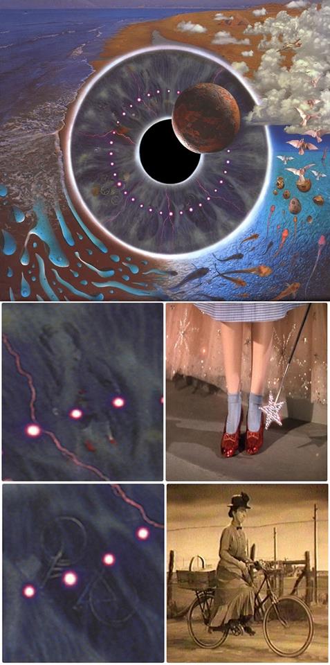 > В 1995-м Pink Floyd снова поиграли с фильмом "Волшебник страны Оз". На обложке альбома Pulse спрятано несколько картинок, связанных с фильмом: силуэт девочки в красных туфельках (Дороти), силуэты Железного Дровосека и Ведьмы на велосипеде.
