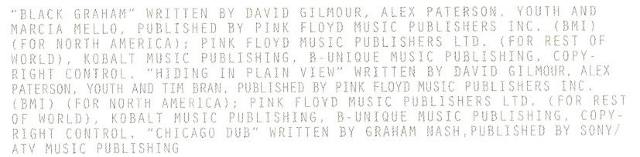 Гилморовские гитары действительно вписались очень здорово! Молодец, Дэвид - достойно наиграл за одну сессию. И вполне разнообразно. Профи - что тут скажешь! Что еще радует - фирменный почерк узнается сразу, а клише (которые, естественно, присутствуют) не мешают воспринимать материал в целом. В этом, считаю, еще и заслуга грамотного и деликатного микширования.