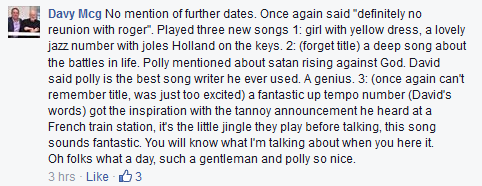 Zuli, есть смутное подозрение, что аккаунт Дэви МакГэ на Фейсбуке создан одним из редакторов davidgilmourtour.com, просуществовал только в течение пары часов, и никаким этим восхищенным бредням про песни номер 1,2,3 верить нельзя.