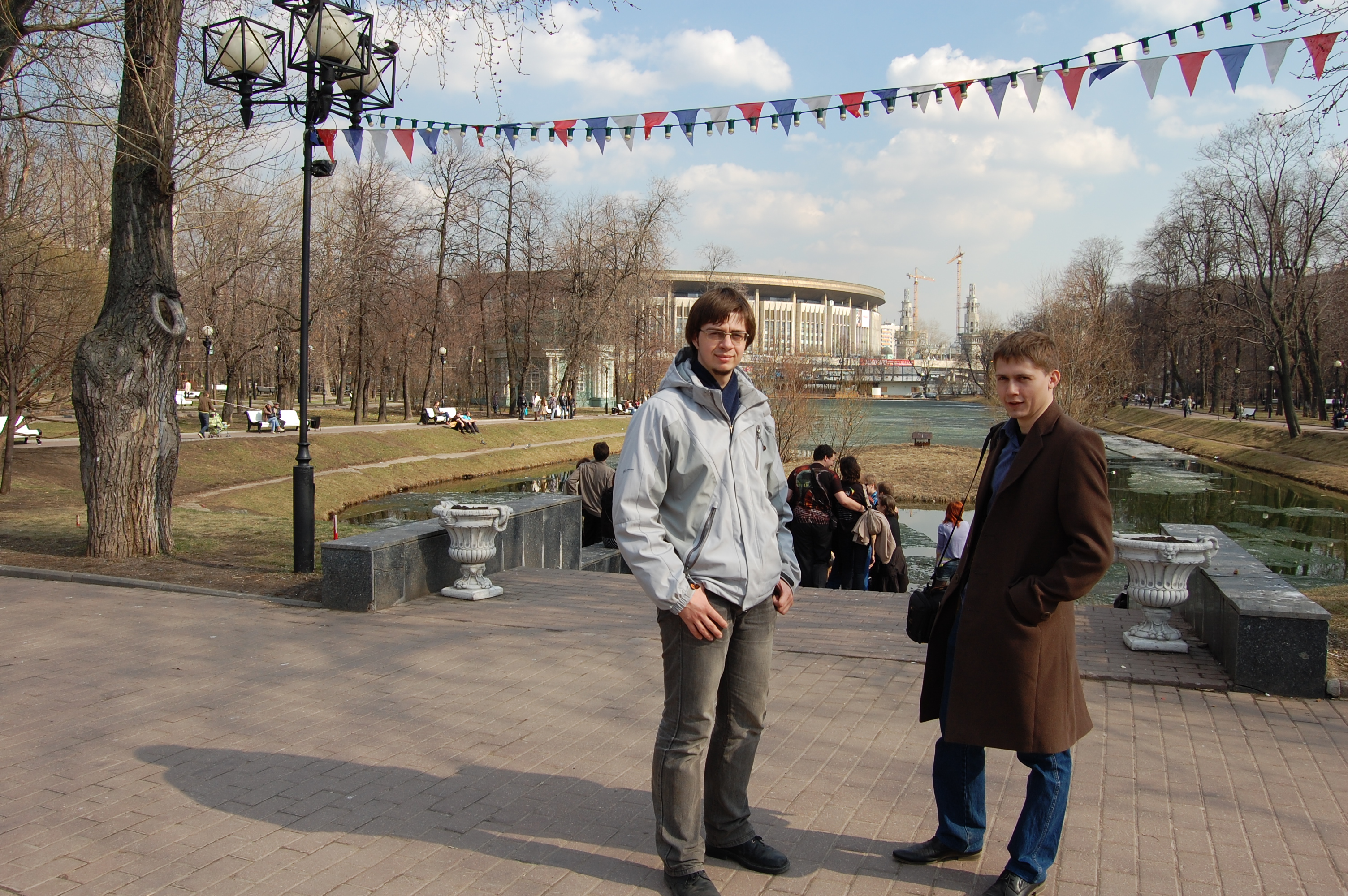 Нашел в архиве фотку, как мы перед московским концертом фоткались на фоне Олимпийского, собрания пинкфлойдофанов, и спины Петровича)