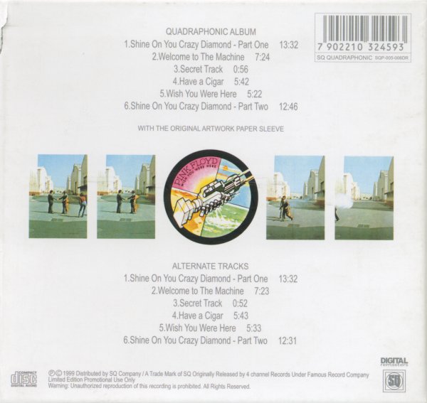 Pink Floyd - Works. Capitol CDP-7-46478-2 (SQ){Only two tracks "Brain Damage" & "Eclipse" from D.S.O.T.M. are Quad}{In comparing the differences between "Works", the standard CD, the stereo LP & the Quad LP of D.S.O.T.M., I have noticed that the two tracks on "Works" are identical to the Quad LP. First I noticed that the bass was mixed far lower and the rear channels were full of sound. The stereo version has much more reverb on it and the bass mix is much louder, the rear channels only contained reverb from the mix.}- Pink Floyd - Total Eclipse. Great Dane Records 6/6 [6CD's] (SQ) [Bootleg]{2 tracks on disk 3 "Brain Damage" & "Eclipse" from D.S.O.T.M. are Quad, probably made from the "Works" CD.}- Pink Floyd - Atom Heart Mother - Collectors Edition. Quadraphonic Mix & + Alt. Remix + BBC LIVE. **SQ-P 003/4 (2 CD) (SQ) [Bootleg]{The CD listed above is available at