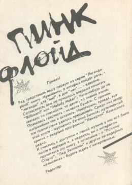 Эта книжка была выпущена в Караганде фирмой ПЛЮС / МИКРО в 1991 году. Год имеет большое значение: кто помнит, тот поймет тогда подобные издания были наперечет. Чудесный человек Леонид Виняр, один из учредителей компьютерной фирмы, предложил сделать что-нибудь полезное для изголодавшегося русскоязычного человечества. Он же написал трогательные слова, которые потом были напечатаны на задней стороне обложки: Привет! Рад представить нашу первую из серии "Легенды рока" книгу. Музыканты, о которых пойдёт речь, -"легенды" для "них", а для "нас" вдвойне. Согласитесь, вам не пришлось вовремя почитать "Вillboard" или "Меlody Maker". Чего-нибудь да не хватало: то гласности, то денег, то знаний языка. Появилась гласность исчезла бумага. С прочим напряженка так и осталась. Некоторым, правда, все эти препятствия удалось преодолеть. Среди них автор зтой книги журналист Евгений Бычков, музыкальный критик и ведущий программы "Камертон" Казахского радио. К счастью, с доступом к самой музыке у нас всё было почти в порядке и, я надеюсь, вы с интересом прочитаете эту книгу, а остальные о "Роллинг Стоунс", "Лед Зеппелин" и других легендарных музыкантах будете ждать с нетерпением. Редактор Продолжения не вышло, времена были не те. Тираж был отпечатан и передан распространителям, но с трудом получаемые отчисления стремительно обесценивались, и затея утратила коммерческий смысл, даже не начав развиваться. Часть тиража, однако, мне удалось закинуть в Москву, где книжка получила некоторый резонанс. Должен сказать, что, работая над ней, я пользовался теми источниками, которые были на тот момент доступны. Таковых было, однако, немного, а слова "интернет" тогда никто не знал. Огромную помощь, сами того поначалу не ведая, оказали две живые легенды первый менеджер Pink Floyd Питер Дженнер и их первый продюсер Джо Бойд, с которыми меня познакомил Артем Троицкий, привезший их в жюри музыкального фестиваля "Голос Азии" (тогда это мероприятие еще привлекало интерес и даже веяло надежду на превращение в нечто музыкально-глобальное; я до сих пор помню факсы, которые мы засылали Питеру Гэбриэлу и Нусрату Фатеху Али Хану. Кончилось все, однако, тем же, чем обычно кончаются ожидания в той части света...) по прошествии многих лет я хотел бы выразить глубокую благодарность АКТ за это знакомство, а также за все его труды и инициативы, равно как и за то, что, прочитав, наконец, эту книжку, у него хватило такта ничего по этому поводу не сказать... По иронии судьбы, одним из московских распространителей моей книжки оказался главный "флойдоман" столицы Сергей Козлов, с которым я познакомился (где же еще?!) в фойе ДК им. Горбунова, где он тогда торговал залежами музыкального самиздата. Узнав, что я собираюсь в Штаты, он снабдил меня гигантской по тем временам суммой, кажется, в 30 долларов, на покупку только что вышедшей тогда книги Никласа Шаффнера "A Saucerful Of Secrets" . Таким образом, книгу Шаффнера я прочитал значительно позже того, как закончил свою. Книга была привезена, торжественно передана Сергею, и впоследствии переведена и выпущена массовым тиражом "Издательством Сергея Козлова". Мне до сих пор приятно думать, что это произошло не без моего косвенного участия. Кстати, русский перевод Шаффнера выложен на сайте Музыкальной лаборатории Алексея Козлова. Готовя собственную книжку 15-летней давности к электронной публи