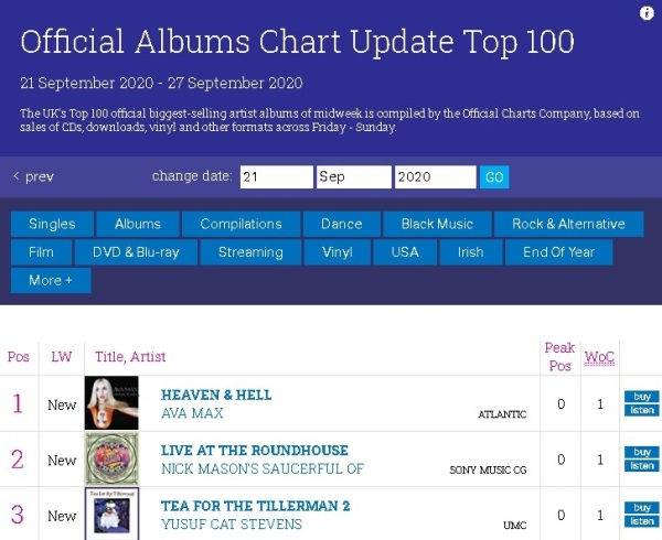Альбомы Nick Mason's Saucerful of Secrets Live at the Roundhouse и "Ava Max Heaven & Hell" оба вышли 18 сентября, и дебютный альбом 26-летней американки в жанре дэнс-поп пока лидирует, а концертный альбом 76-летнего мастера психоделического рока чуть-чуть отстаёт. Замыкает динамическую тройку лидеров альбом Юсуфа/Кэт Стивенса "Tea for the Tillerman 2" юбилейная перезапись альбома 1970 года (тоже вышедшая 18.09).