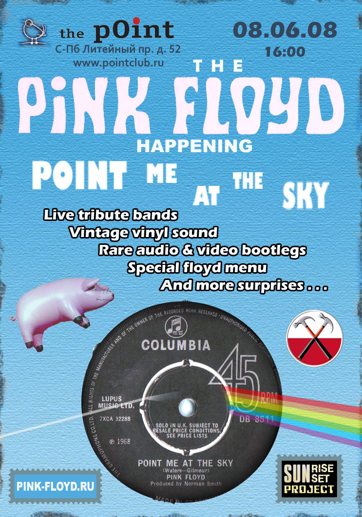 8-го июня 2008 года в Санкт-Петербурге состоится особенное событие, названное как "The Pink Floyd Happening: Point Me At The Sky". Это будет творческий вечер с культурной программой, приуроченный к выступлению Роджера Уотерса на Дворцовой площади 6-го июня. Хэппенинг будет проходить в арт-клубе the Point, расположенном по адресу: Литейный пр., д. 52 (подробнее о клубе на Интернет-сайте: ). Начало в 16:00.