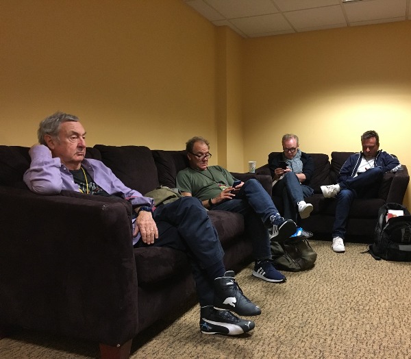 Перед выходом на сцену Palace Theatre, Колумбус, Огайо, 7 апреля 2019 г. Пока Гай, Гэри и Дом уткнулись в свои телефоны и не замечают, как Ли делает этот снимок, Ник задается вопросом: разглядят ли флойдоведы одну мелкую деталь на его кедах? |