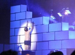 на сцене строилась настоящая стена из картонных кирпичей (маленькие