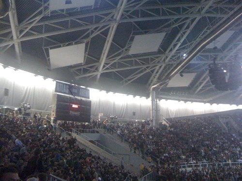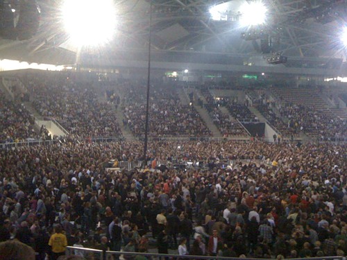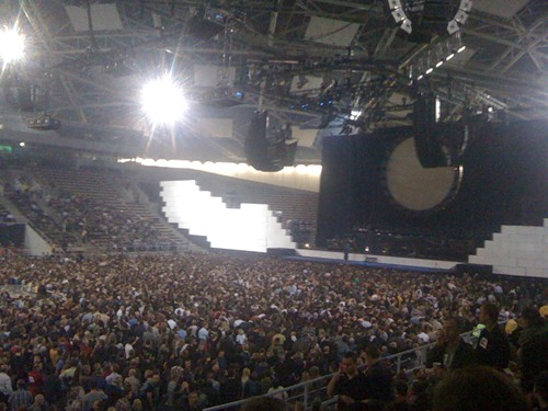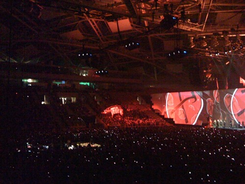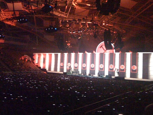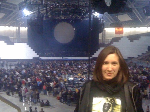 На подъезде к Атлас Арене наконец-то увидели толпы людей в тематических футболках, но, кажется, так и не увидели ни одной афиши. Внутрь прошли вообще без каких-либо очередей, наши распечатки вопросов не вызвали, сумки никто не проверял. Фотоаппарат я специально не брала, чтобы не отвлекаться от просмотра шоу, поэтому те несколько фотографий, которые я все-таки сделала на память, телефонного качества.