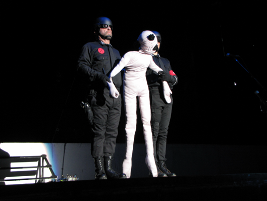 Потом было очень интересно рассматривать, как снизу появились инструменты, вышли бэк-вокалисты и начали петь “The Show Must Go On”. И вот Роджер снова выходит в образе вождя, вылетает свинья, но она позади, смотреть на нее неудобно, поэтому я уделил ей немного внимания. И нам тут же захотелось, чтобы он расстрелял именно нас. И когда он начал стрелять из автомата в нашу сторону, как-то само собой захотелось подыграть Роджеру и изобразить, как будто он в меня попал. Но надо было держаться крепче, поэтому мой артистический порыв был краток и невыразителен.