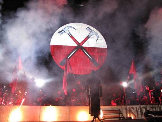 На “Run Like Hell” выполнять приказы вождя не получилось. Хлопать было никак нельзя, потому что надо было крепко держаться за поручень. Но все равно песня опять вызывала очень мощные эмоции. А потом был гипнотизирующий мегафон на “Waiting for the Worms”, который внезапно оборвался на “Stop”. Музыканты быстро покидают сцену, техники уносят инструменты, и во время “The Trial” ударная установка опускается вниз. Роджер ходит по сцене, театрально изображая образы, роли которых исполняет. И вот снова призыв: «Tear down the wall!» А внизу уже ходит охрана и следит, чтобы все убрали руки с поручней и отошли немного назад.