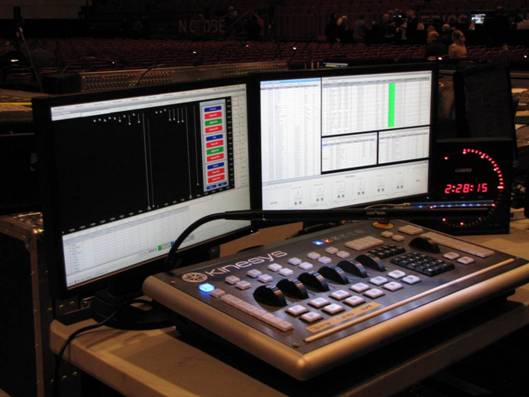 В зале на соседнем месте уже сидел человек (наверно, я купил билет, предназначавшийся для его спутника, который не смог прийти). Мое место было слева от пульта, и я решил взглянуть на него поближе. Увидел ящик с надписью “RW Puppets Backup Console”, на котором стояли два монитора и пульт управления (Kinesys K2). Стало ясно, что это пульт управления куклами. Сделал несколько снимков с разных сторон пульта, и ко мне подошел охранник. Сказал, что мой фотоаппарат слишком большой и его надо сдать. Я сказал, что еще вчера никаких проблем с ним не было, и что на входе тоже пропустили без разговоров. На это он ответил, что это распоряжение продюсеров, и чтобы не было проблем, мне надо прислушаться к нему, потому что если я буду снимать на концерте, и меня заметит продюсер, им придется помешать мне наслаждаться концертом, а он не хочет, чтобы у меня испортилось впечатление от шоу. Я убрал камеру, он пожелал мне хорошего вечера и ушел. Непривычно было, что он разговаривал со мной очень спокойно, вежливо и дружелюбно, без агрессии и каких-либо угроз.