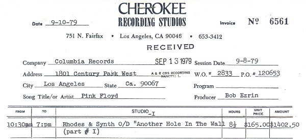 Самый впечатляющий документ в книге: на третий день в Чероки, 8 сентября 79, Рик писал овердабы для песни "Еще одна дыра в стене"
