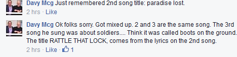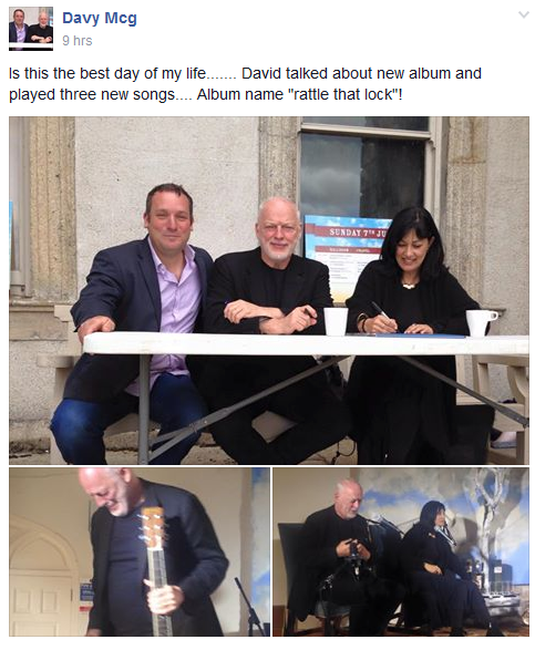 Zuli, есть смутное подозрение, что аккаунт Дэви МакГэ на Фейсбуке создан одним из редакторов davidgilmourtour.com, просуществовал только в течение пары часов, и никаким этим восхищенным бредням про песни номер 1,2,3 верить нельзя.