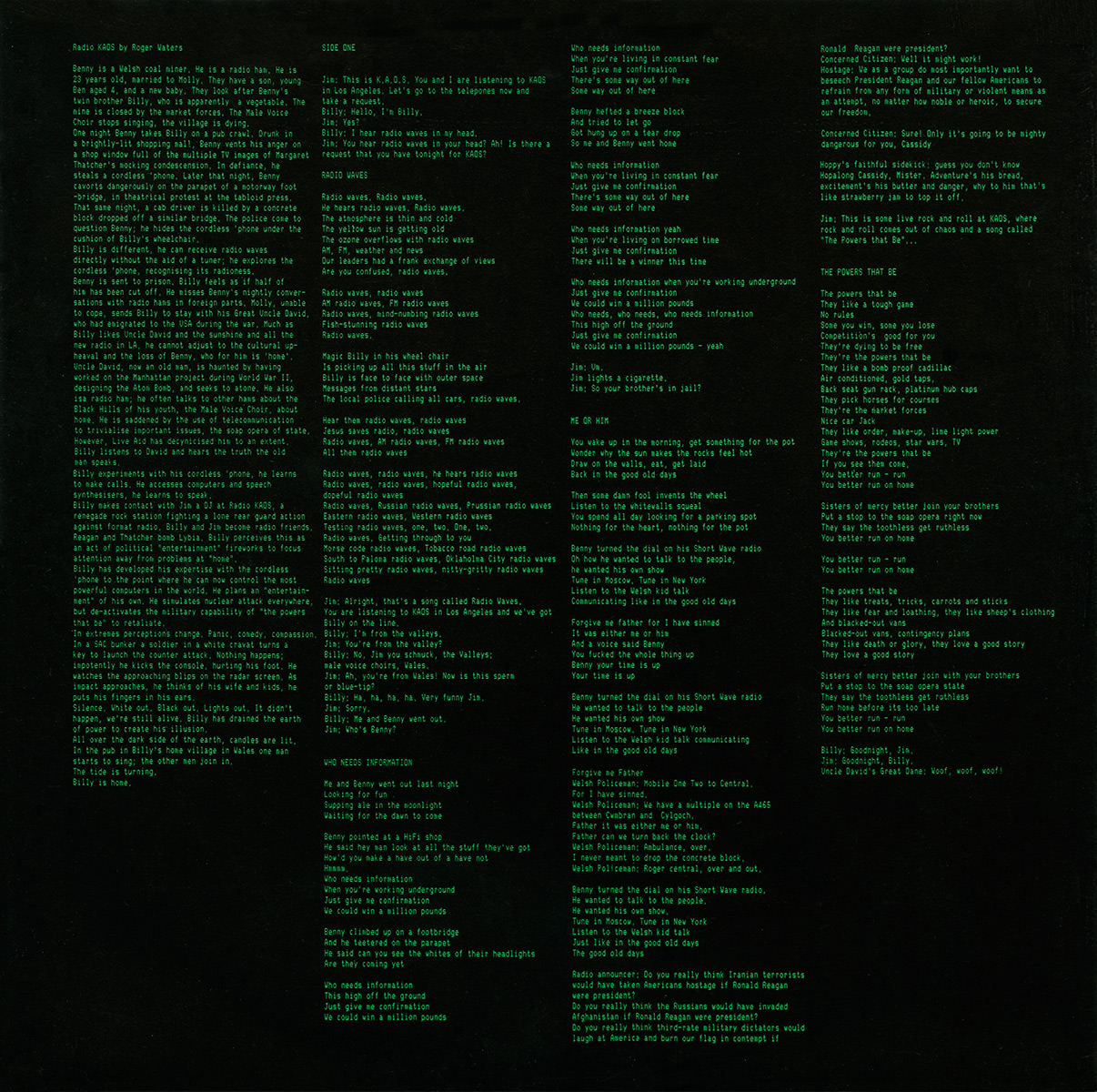Решила тут подправить статью на Википедии про альбом, а то там что-то ни слова о сюжете не было сказано. Подправила где-то в начале осени (правда ой как не оригинально: всего-то навсего сослалась на описание Маббетта), уже и думать об этом забыла... как вдруг редакторам понадобились авторитетные источники. Маббетт же говорит, что краткое содержание и на конверте альбома есть. Если у кого-нибудь есть фотография этого описания, буду очень признательна)