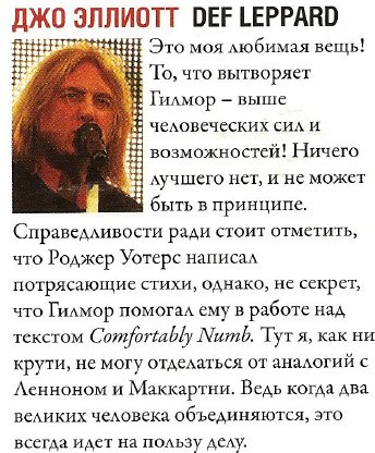 В 83-м выпуске журнала Classic Rock(2010) привели комментарий Джо Эллиотта, где он говорит, что якобы Гилмор помогал Уотерсу "в работе над текстом Comfortably Numb".