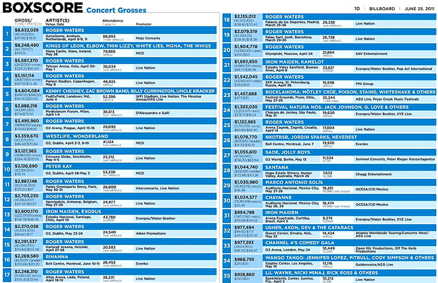 Очередная порция концертных сборов из Billboard за 25 июня. Кто интересовался сколько народу пришло на шоу Уотерса в Москве и Питере, пожалуйста.