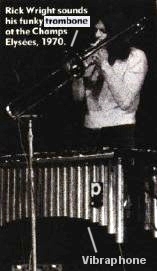 В пост - сидовском PF он немножко играл на тромбоне (AFTERNOON/BIDING MY TIME) и упорно продолжал любить звучание медных духовых , полученное на мелотроне или синтезаторе. В JULIA DREAM он впервые использовал мелотрон (клавишный инструмент который был так сказать ранним "сэмплером", в котором воспроизводились ленты с уже записанными инструментами , включая струнные , хор , флейту и медные) для создания звука флейты. РИК также использовал секцию мелотрона с лентами "медных" на SUMMER '68 для создания соло на "трубе". Мелотроны были жутко нестабильными и PF никогда не давали концерты и не ездили на гастроли с их образчиками ( у них был один из только шести произведённых экземпляров чёрной модели MK 4000 MK II , а другой приобрела принцесса Маргарет). После записи AHM он был отправлен на склад , где и окончил свои дни , будучи необратимо повреждённым до своего спасения , ремонта и последующей перепродажи.
