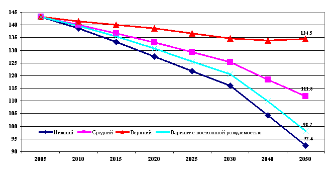 Прогнозная динамика численности населения России по прогнозу ООН 2005–2050 выглядит так (млн. чел.):
