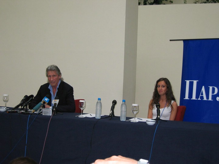 Роджер Уотерс на пресс-конференции и его переводчица.