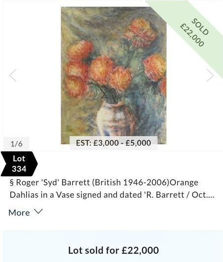 Картина Роджера 'Сида' Барретта "Оранжевые георгины в вазе" (Orange Dahlias in a Vase), написанная им в октябре 1961 года и принадлежавшая наследникам учителя рисования Джеральда Хардена, ушла с молотка на сегодняшнем аукционе в Кембридже за солидную сумму £22000 (2,3 млн. ₽).