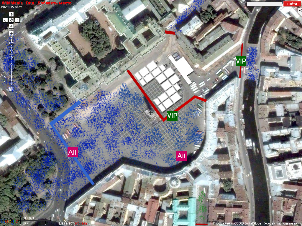 По имеющейся информации, сцена будет располагаться около моста через Мойку. Если смотреть на сцену, то Зимний дворец будет располагаться слева, а здание ГенШтаба справа. Пустая дырка на схеме это колонна. Те места, что сейчас есть на сайте поступившие на данный момент в продажу.