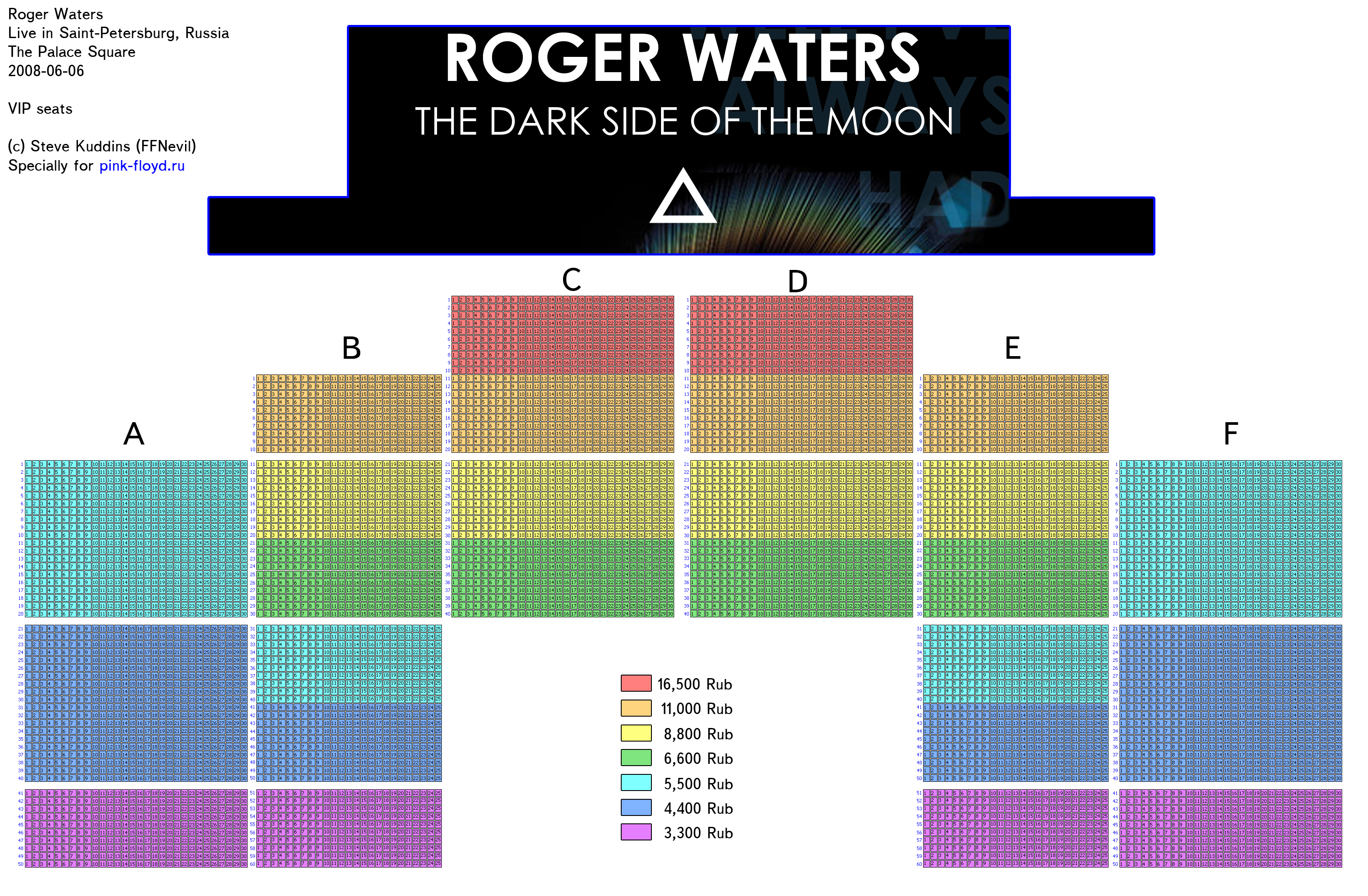 FFNevil составил схему зала с расположением мест относительно сцены. Вы можете скачать ее с нашего сайта по ссылке http://pink-floyd.ru/downloads/waters_spb.png.