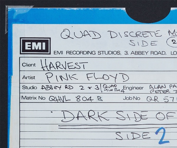 2) реплика инвентарной карточки единицы хранения «Квадрофоническая дискретная мастер-лента The Dark Side of the Moon – Сторона 1» с указанием технических деталей записи и треклистом первой стороны.