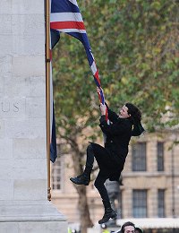 Ранее, в четверг, Чарли принял участие в манифестации, переросшей в общественные беспорядки. В её ходе он попытался сорвать с Кенотафа на Уайтхолл-стрит, главного военного мемориала Великобритании, флаг страны.