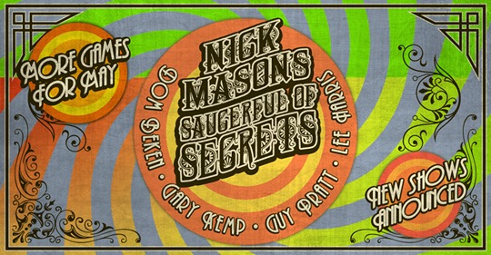 Клич, брошенный в конце прошлой недели "More Games for May!", обернулся для поклонников группы Ника Мэйсона Saucerful of Secrets четырьмя "играми" апреля (в том числе 24-го апреля, в пятницу, под куполом площадке драматичного "полудебюта" программы Dark Side of the Moon) и четырнадцатью дополнительными играми мая и начала июня по всей Европе в Бельгии, Люксембурге, Германии, Франции, Швейцарии, Австрии, Чехии, Голландии и Дании. Билеты на это "море игр" уже поступили в продажу сегодня днем.