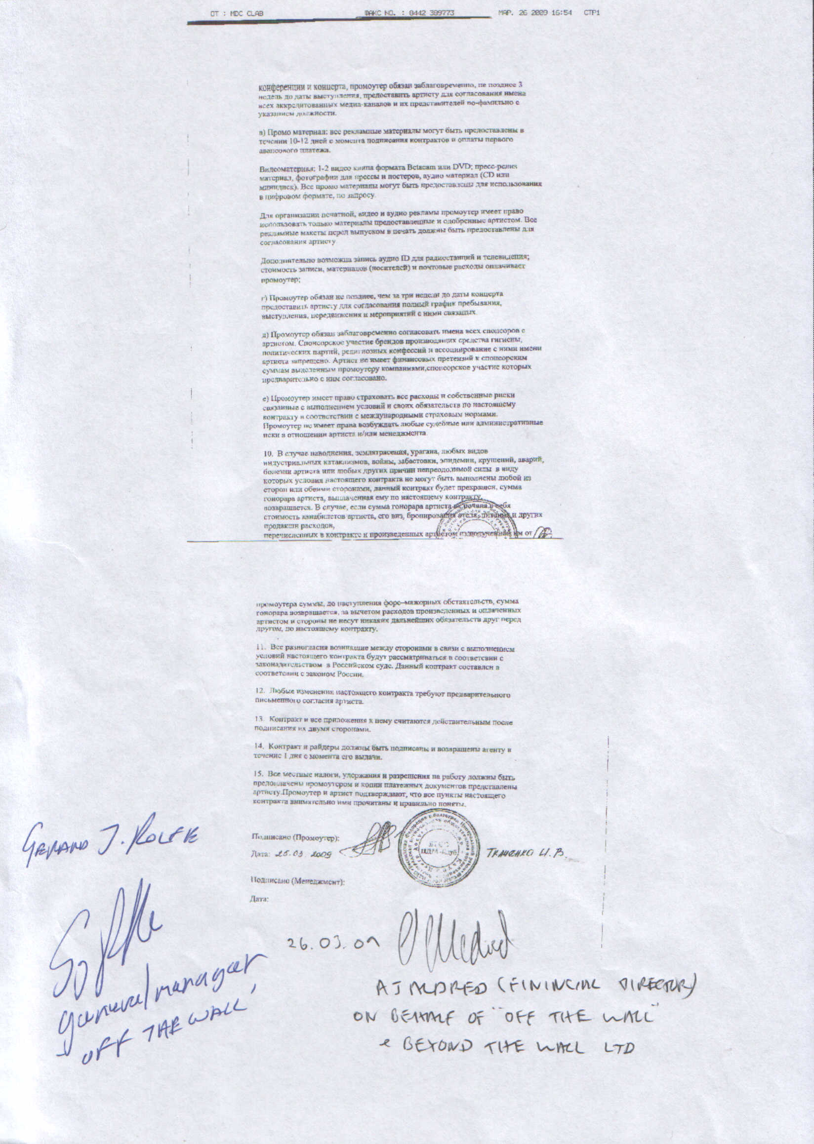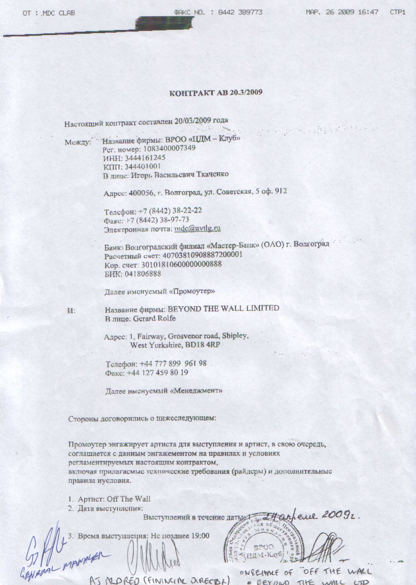 Roman Javitsa, в котором он подтвердил заключение контракта на выступление группы в Волгограде и прояснил ситуацию с правами на название "Off The Wall".