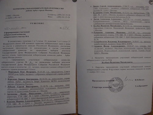 Я выбрал себе участок №6 (тихие арбатские переулки) потому что я там прописан и вообще с прошлых выборов в МосГорДуму мне не верилось, что у нас большинство по району голосовало за Едро, и я решил это проверить. Однако выяснилось, что наблюдатель от Яблока на нашем участке уже есть, а двух наблюдателей от одной партии на одном участке одновременно быть не может и я уже внутренне сказал себе "ну что ж - в другой раз понаблюдательствую" когда мне предложили стать членом избиркома по этому же участку с правом совещательного голоса от Яблока, что допускается ФЗ-51. Это несколько усложняло процедуру, но я согласился.