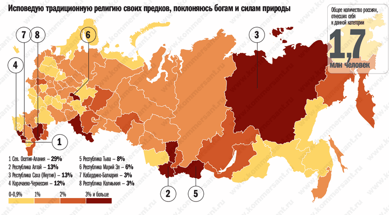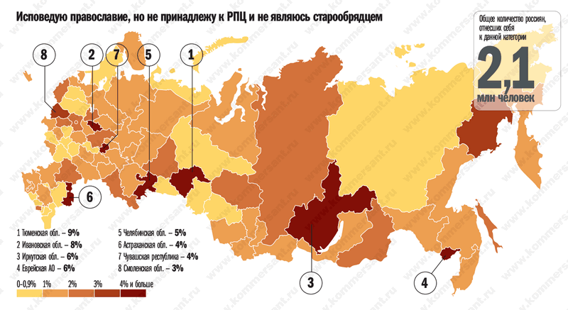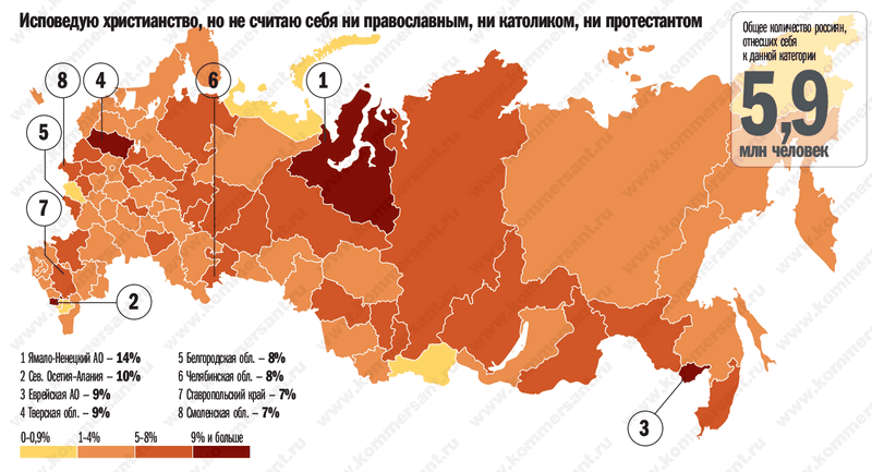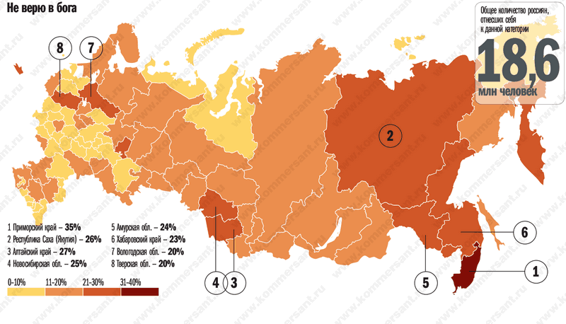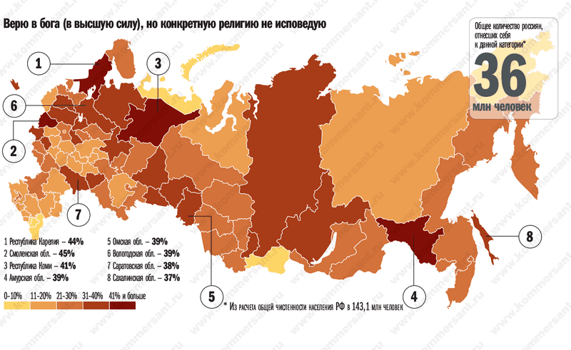 Социологи некоммерческой исследовательской службы «Среда» впервые составили Атлас религий России. На фоне дискуссии об отношениях с религией власти и общества он дает представление о том, во что и как верят россияне.